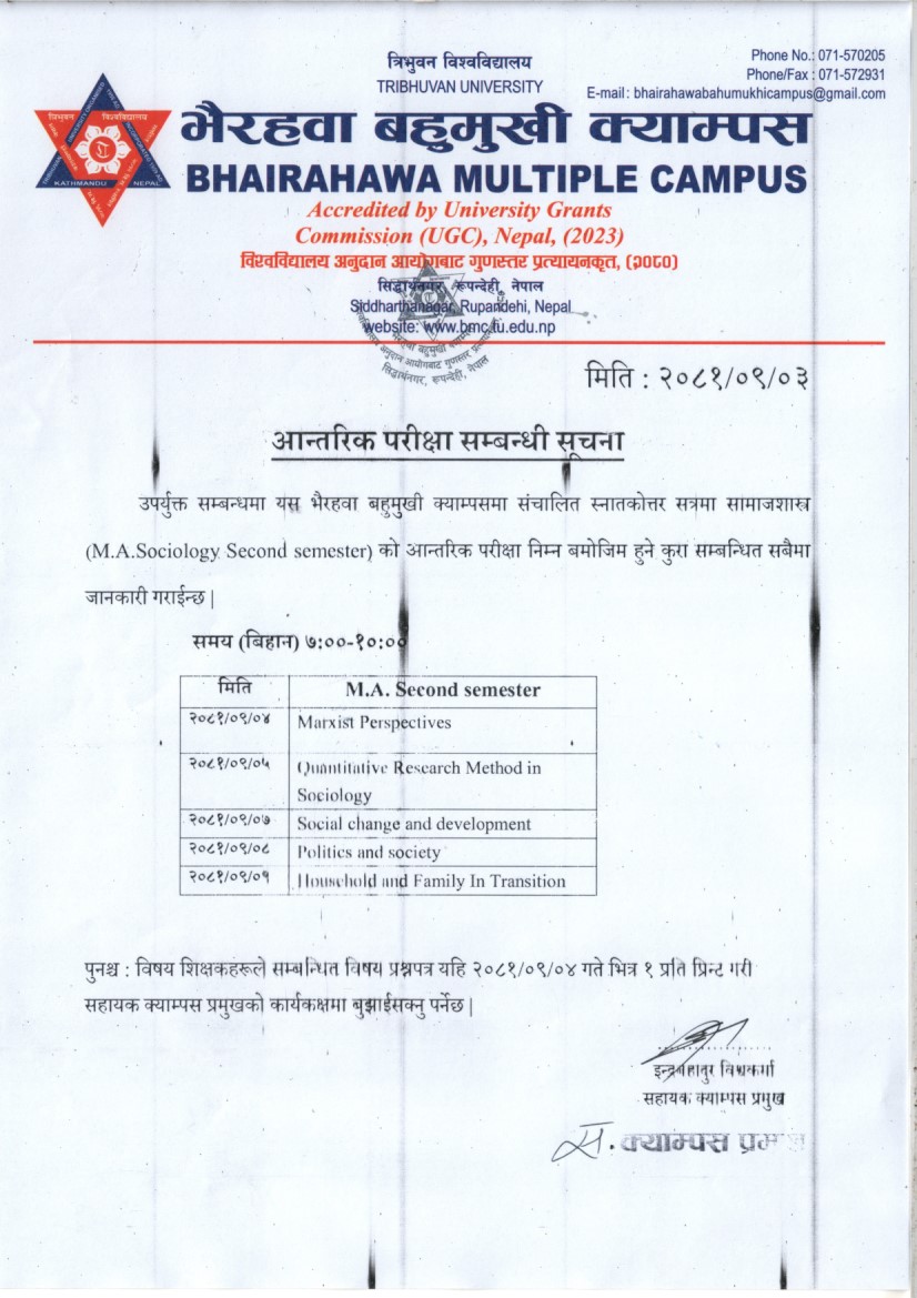 एम. ए. समाजशास्त्र तेस्रो सत्रको कक्षा सञ्चालनसम्बन्धी सूचना