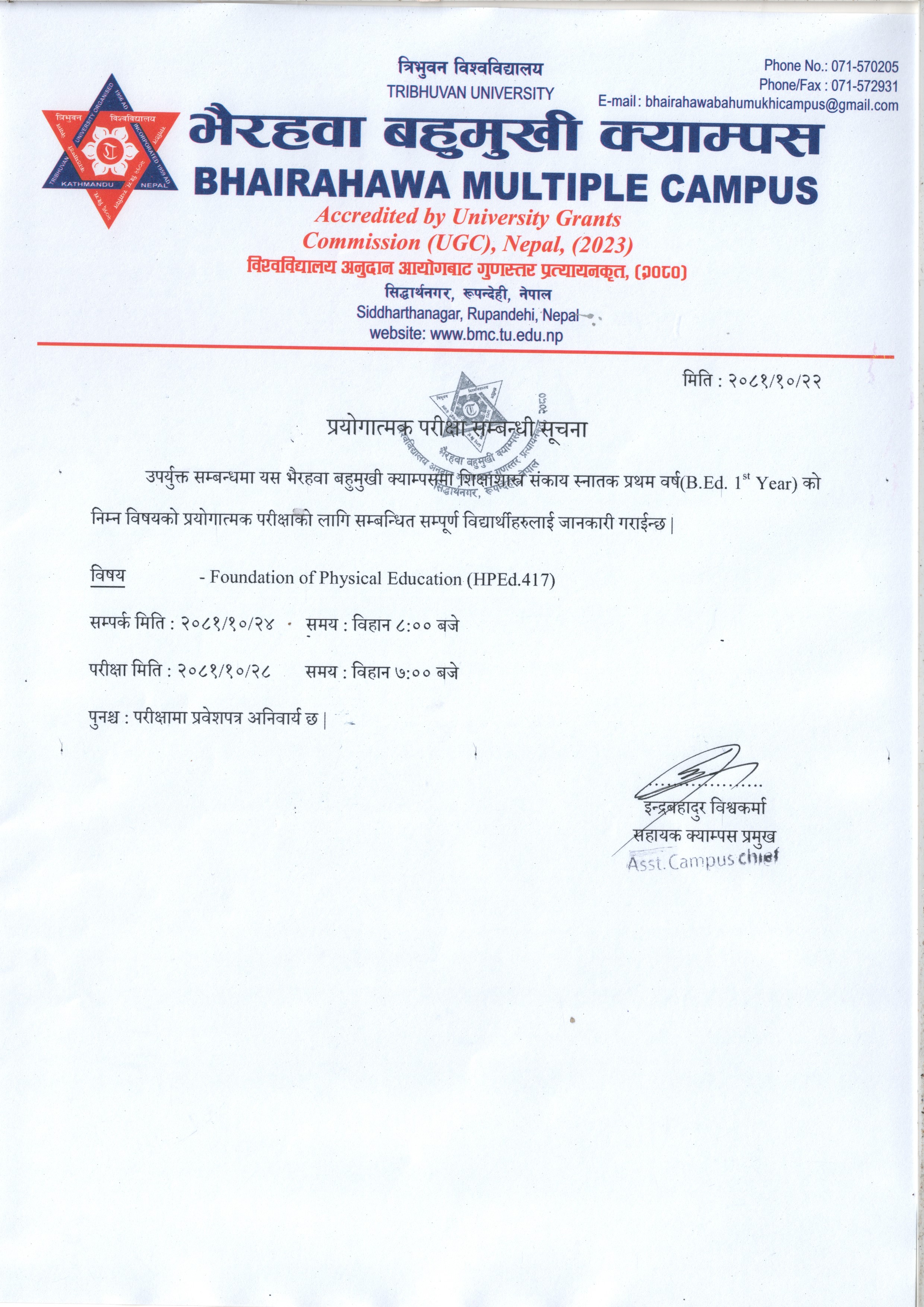 स्नातक तह प्रथम वर्ष २०८२ समूहमा भर्ना भई त्रि.वि...