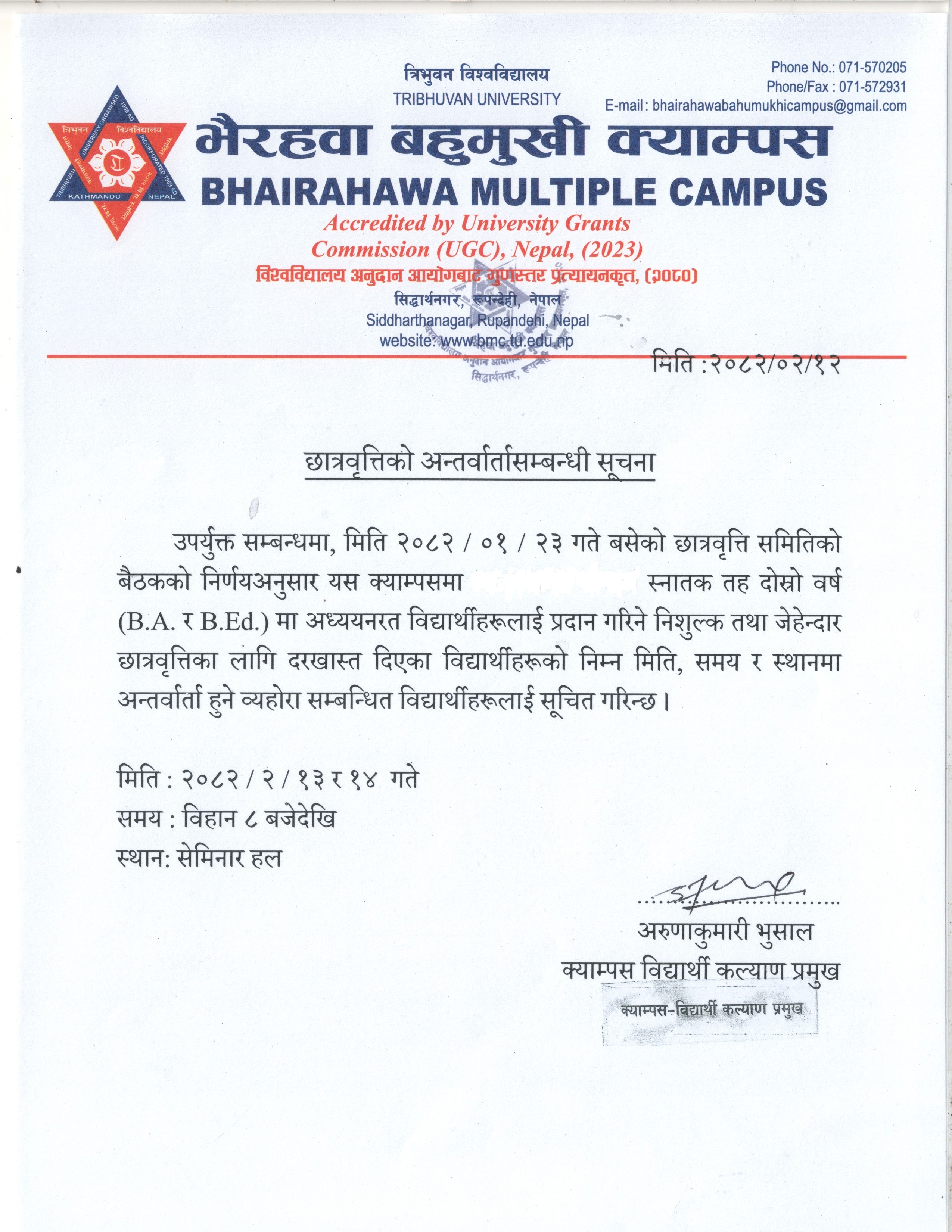 B.A. र B.Ed. छात्रवृतिको अन्तर्वार्तासम्बन्धी सूचना